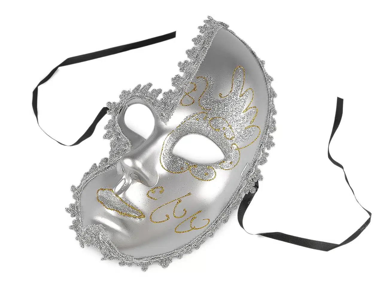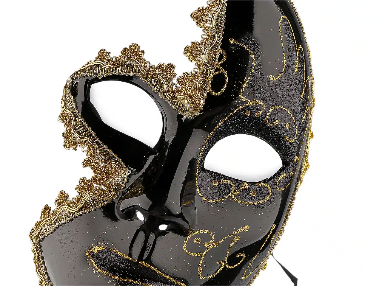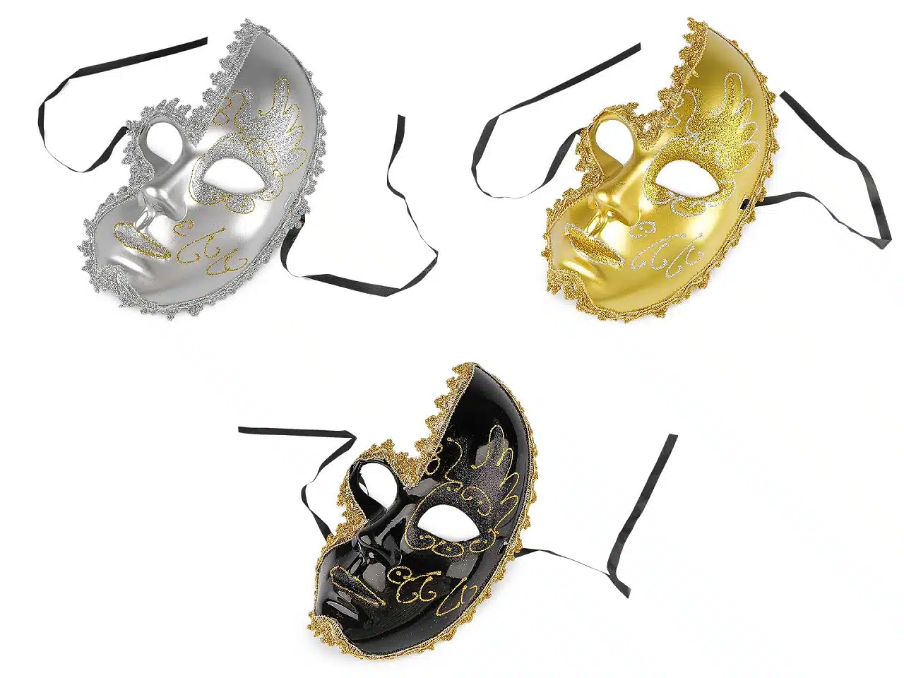 Poți folosi masca venețiană pentru petreceri, baluri, carnavaluri și spectacole teatrale. Va adăuga misticism aspectului tău. Este acoperită pe alocuri cu sclipici și decorată cu o împletitură leonină.