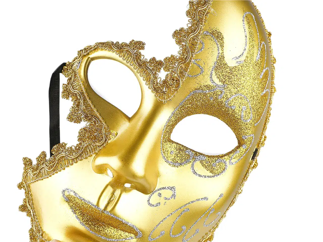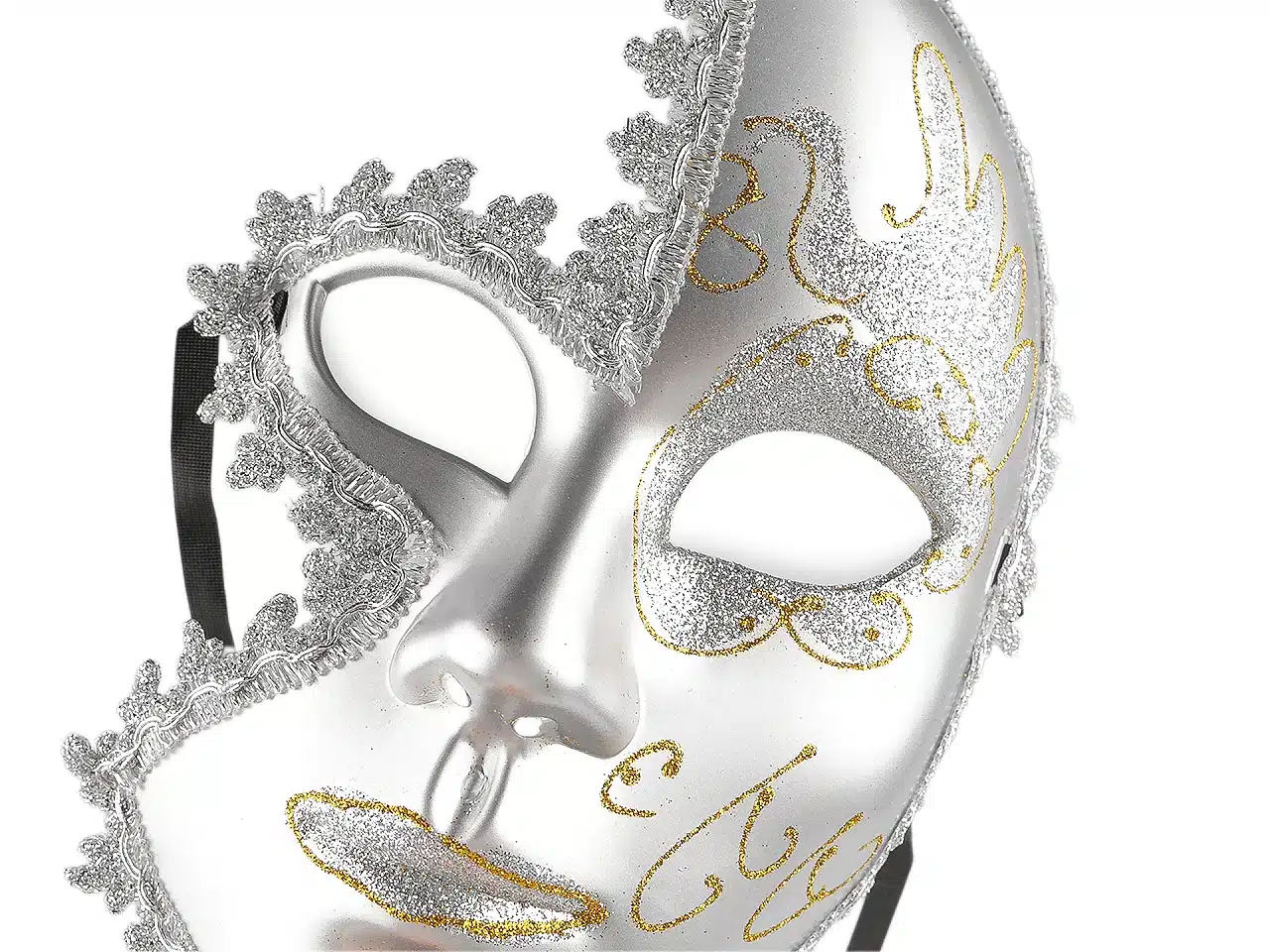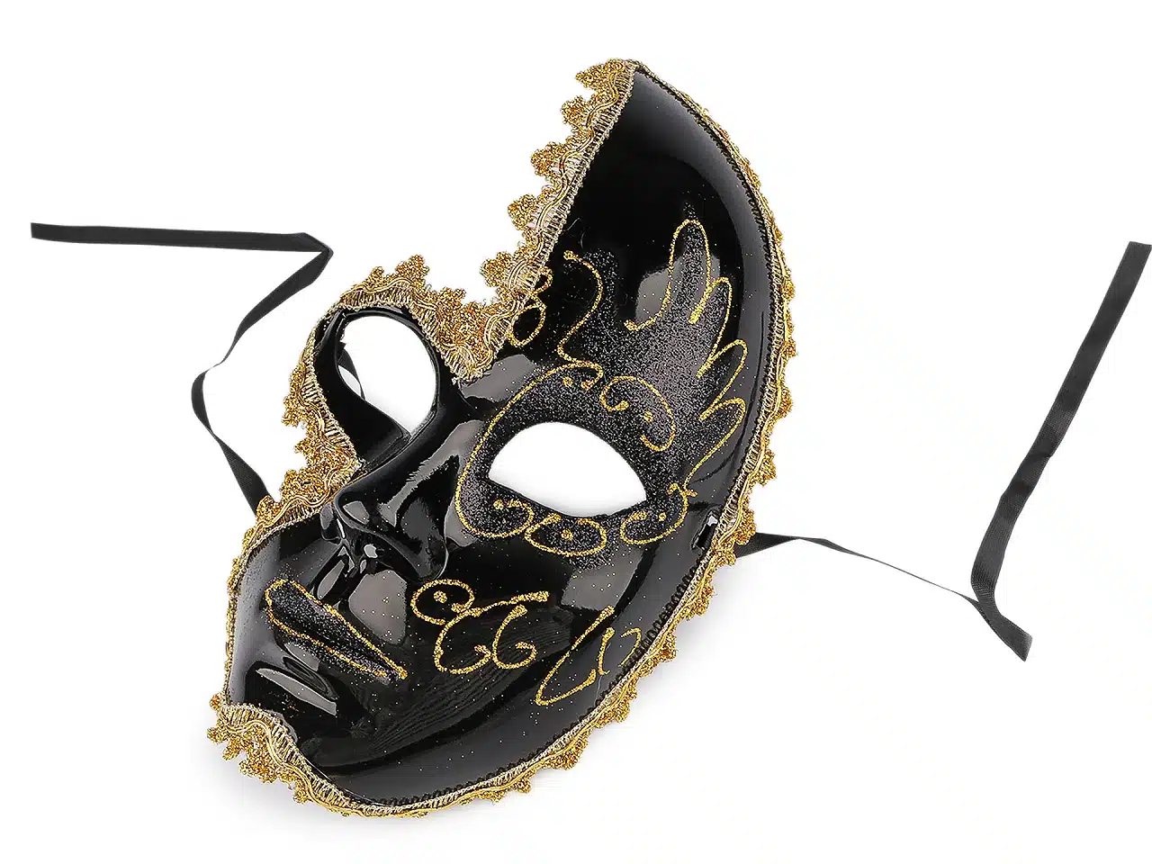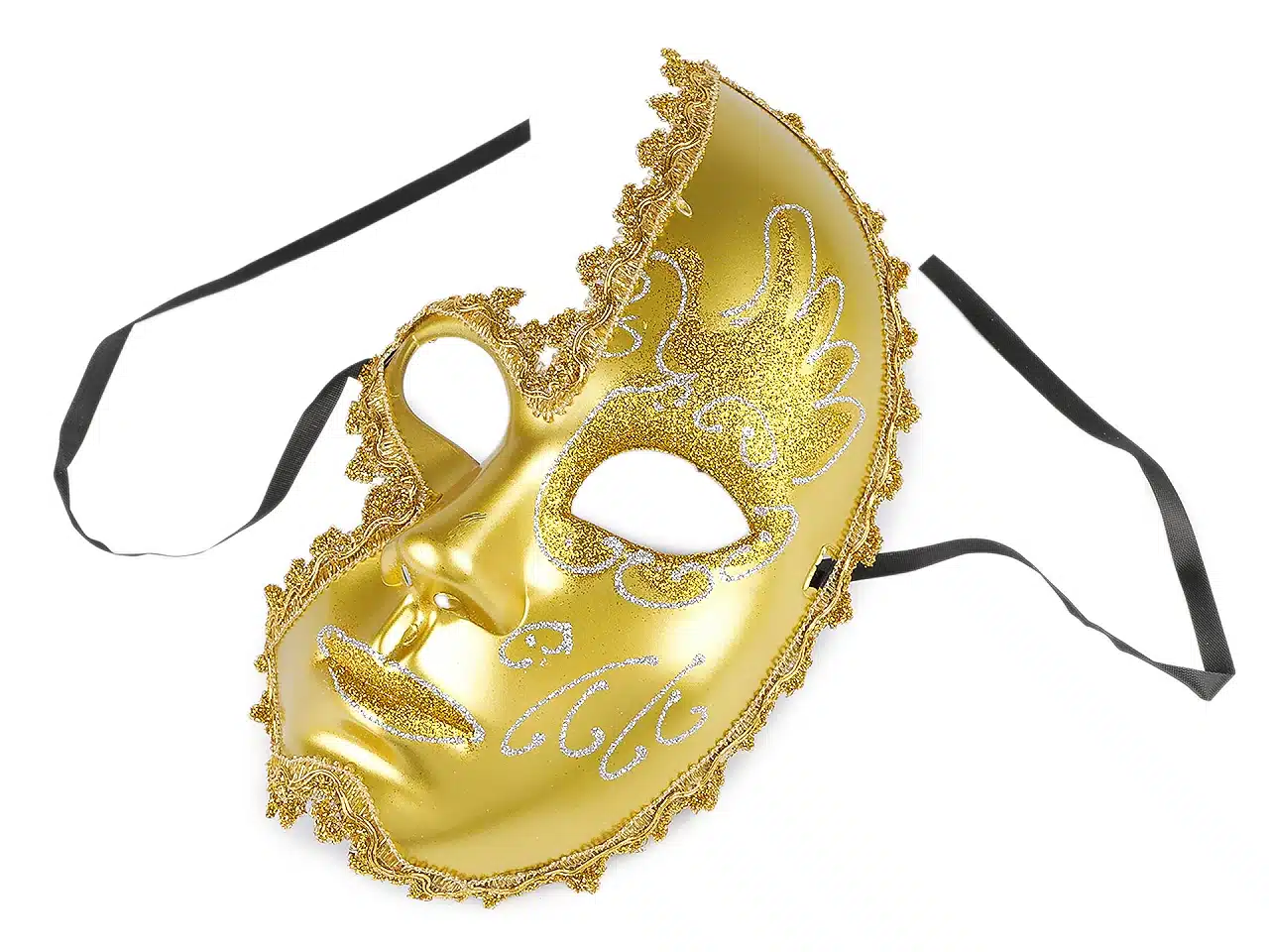 Poți folosi masca venețiană pentru petreceri, baluri, carnavaluri și spectacole teatrale. Va adăuga misticism aspectului tău. Este acoperită pe alocuri cu sclipici și decorată cu o împletitură leonină.